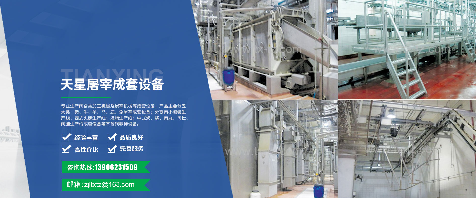 專業生產肉食類加工機械及屠宰機械等成套設備,產品主要分五大類:豬、牛、羊、馬、鹿、兔屠宰成套設備;分割肉小包裝生產線;西式火腿生產線;灌腸生產線;中式烤、燒、肉丸、肉松、肉脯生產線成套設備等不銹鋼非標設備